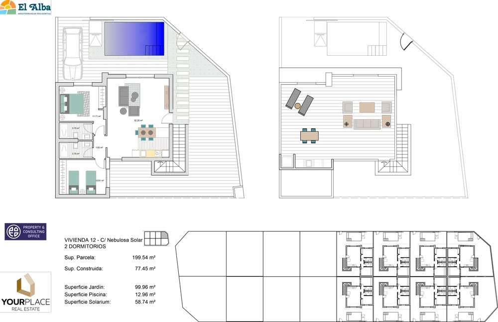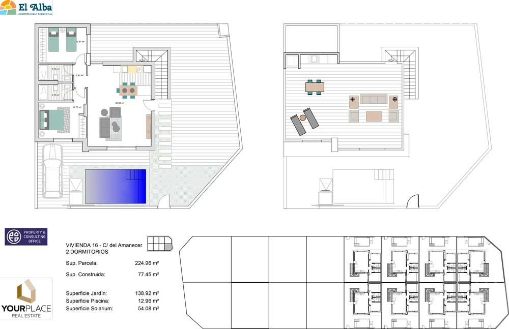 El Alba Residencial Mediterráneo is een luxe complex van villa's met één of twee niveaus, afhankelijk van het aantal slaapkamers, met privézwembad, terras en solarium met zomerkeuken waarmee u elke dag van het jaar kunt genieten van alle uren zonneschijn.